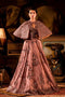 DESCRIPTION | Peach Off-shoulder gown is embellished with Cut dana, sequin and beads. Featured with drape off-shoulder and gather on border. |