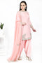 DESCRIPTION | Blush pink sharara embellished with french knot, dori, and zardozi. Highlight with sequin and beads. Paired with georgette sharara and net dupatta. |