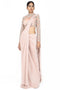 Peach blush drape embroidery with sequin, cut dana and beads. Highlight with crystallised fringes. Featured with crystallised scallop border and flare on boder. Paired with cape, blouse and saree.