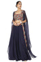 Turquoise blueombre drape embellished with threads, zardozi, and beads. Highlight with pearls. Featured with off-shoulder blouse. Paired with pants.