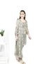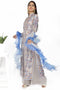 Sky grayish embellished with sequin and zari. Featuring jewel neck and tulip sleeves. Paired it with emellish border dupatta with pearls and stone and straight pant.