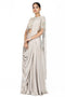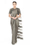 DESCRIPTION | Metallic brass golden embellished with zardozi,beads, cut dana, stone and sequin. Featured with jewel neck and sheer back blouse. Paired it with lurex silk saree. |