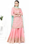 DESCRIPTION | Champagne pink embellished with sequin, mirror and kasab at bodice and at back with keyhole. Paired it with banarasi sharara and crystallised scallop dupatta. |