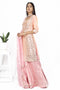 DESCRIPTION | Light pink sharara set embellish with gota patti with zari. Highlight with stone and aari work on border. Paired with dupatta and sharara. |