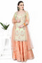 DESCRIPTION | Pale pink embellished with zari, pearls, sequin and zardozi. Highlight with stone and beads. Featuring with jewel neck and half-circular flare sleeves. Paired with embellished dupatta and sharara. |