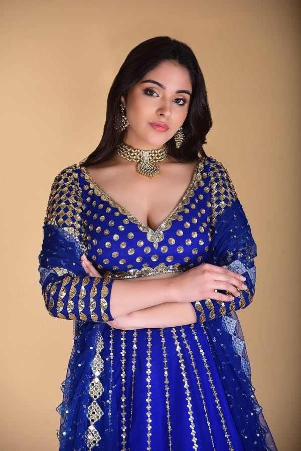 DESCRIPTION | Royal blue Lehenga set is embellished with sequence works all over lehenga set. Paired with embroidered mirror work dupatta and gather at bottom of lehenga. |